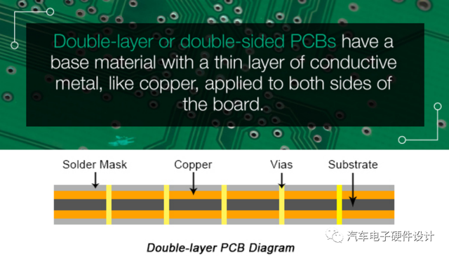 雙層或雙面PCB的基材均帶有一層導電金屬薄層(如銅),涂在板的兩面。穿過板子的孔可以使板子一側的電路連接到另一側的電路。